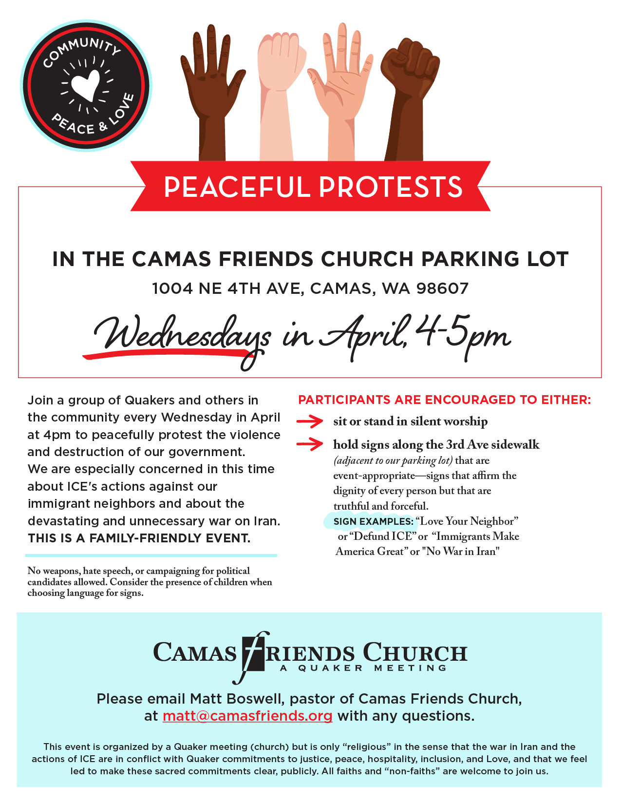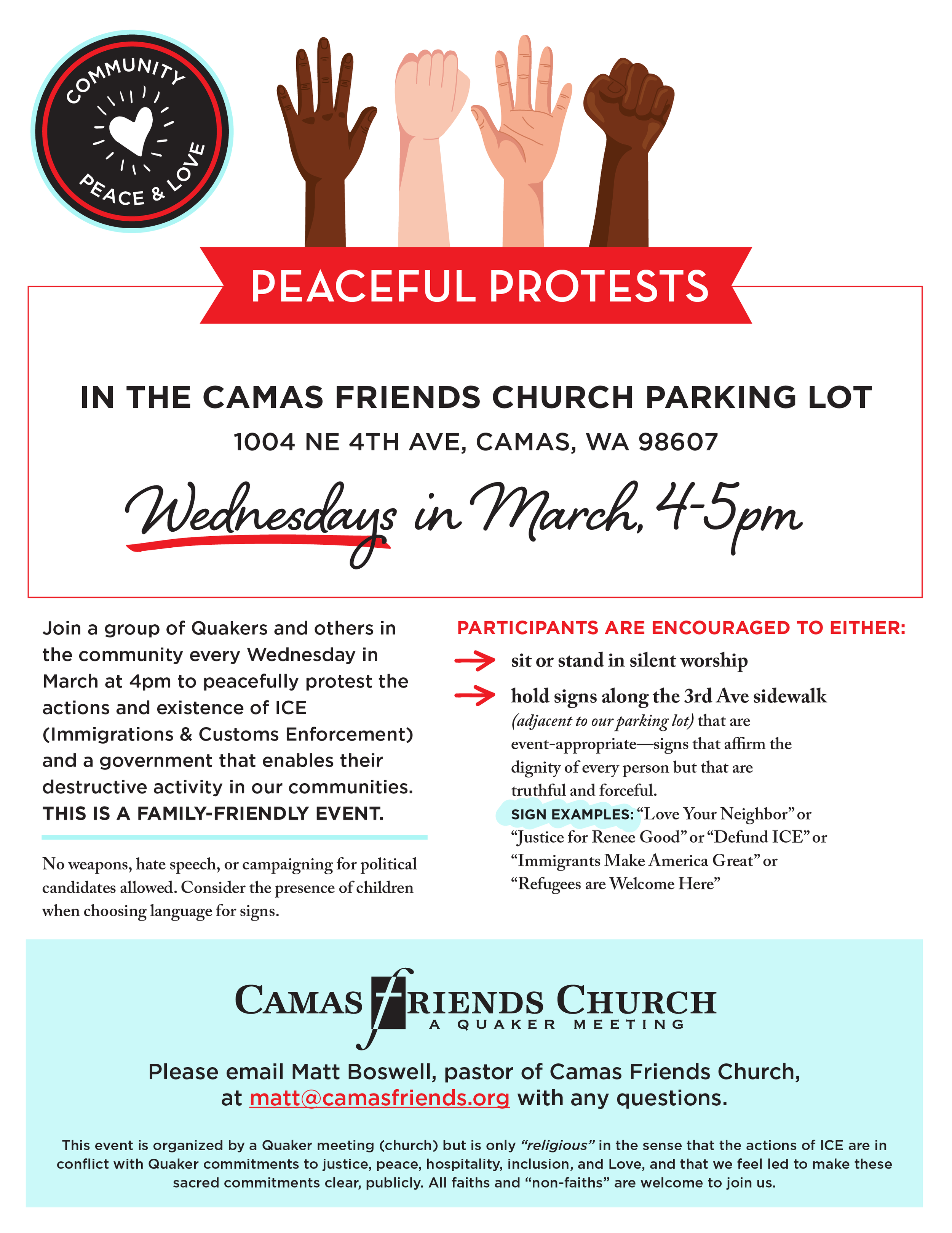 The Camas Friends Church Peace and Social Concerns Committee wants to provide you with a few resources to empower you if you encounter a situation involving Federal Immigration Agents or an immigrant who needs assistance. We are building local relationships to support our immigrant neighbors and hope to become more involved in this time of crisis.